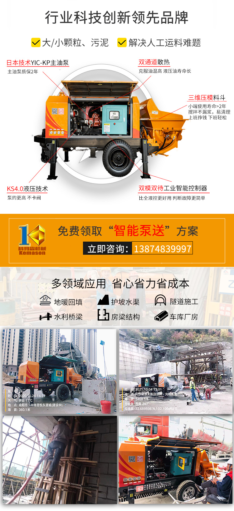 性能特点:泵机重量轻,移动方便 性能稳定,结构紧凑,故障率低,寿命长。 单泵双回路系统、带显示屏、智能泵送、无线遥控、可根据客户需求提供技术解决方案